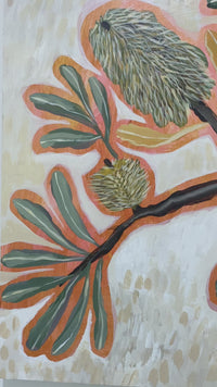 This beautiful artwork, created by Kate Soady, captures the essence of the Banksia flower and pod and Billy Buttons in an earthy colour palette. It is perfect for adding a touch of nature to your home decor. Own a one-of-a-kind original from the Blue Mountains artist.