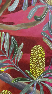 This semi-abstract painting depicts Australian native flowers and a Superb Lyrebird. There is a joyful wondrous exuberance in Kate's colourful native botanical artworks.