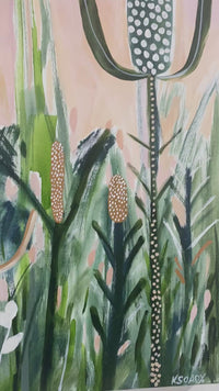 In this vibrant semi-abstract painting, native Australian flora is reimagined through expressive mark-making, rich textures, and harmonious layers of colour. Soft pinks, earthy greens, and luminous whites evoke the untamed beauty of a wild meadow, inviting the viewer into a dreamlike landscape where nature’s forms are both familiar and free. This piece celebrates the raw spirit of the Australian bush through intuitive brushwork and a deeply personal artistic language.